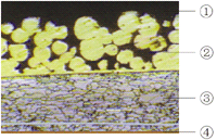 1. 改性聚四氟乙烯(PTFE)铅(Pb )及其它填充混合物 0.01~0.03mm,一种耐磨材料,运作过程中可形成转移膜以保护对磨轴。 2. 铜粉层0.2~0.3mm提高PTFE/Pb与钢板的结合强度,具有很好的承载能力和耐磨性。同时铜又是一种很好的导热材料,可快速转移轴承运作过程中产生的热量。 3. 低碳钢0.7-2.3mm,提高轴承的承载能力和热转移作用。 4. 铜/锡电镀层,铜镀层0.008mm,锡镀层0.005mm,使轴承有很好的耐腐蚀功能。 | |